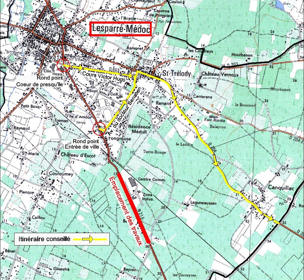 En complément d’information, voici un plan détaillant les déviations recommandées dans le sens Lesparre/Bordeaux (valable aussi dans le sens Bordeaux/Lesparre) :