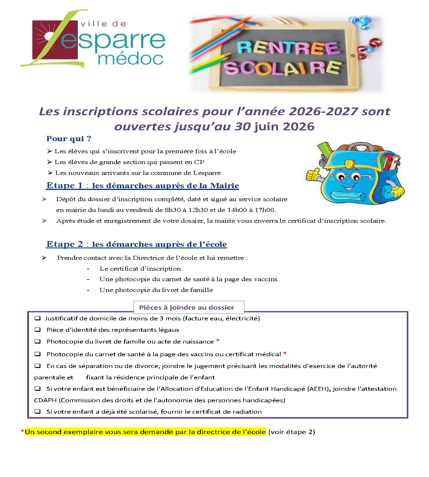 La Ville de Lesparre-Médoc vous informe que les inscriptions scolaires pour l’année 2026-2027 sont ouvertes jusqu’au 30 juin 2026 au service scolaire.